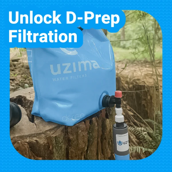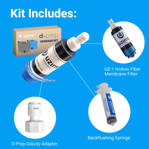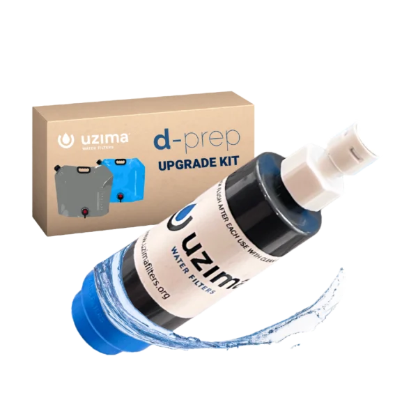 Upgrade your existing D-Prep water bag with this kit—featuring the Uzima UZ-1 gravity filter and universal adapter—to unlock the full capabilities of the D-Prep+ emergency water system.