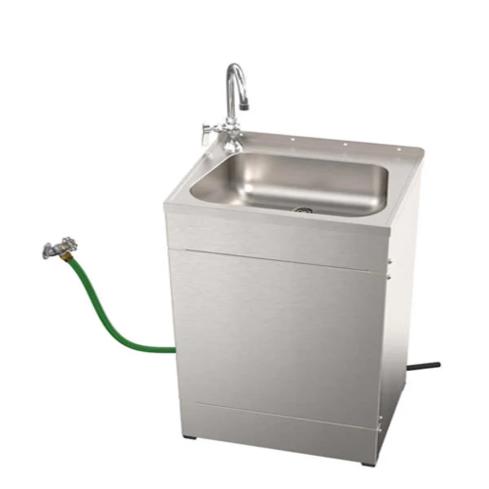 This model is hand-operated and provides 3/4″ hose connections behind the unit for both fresh water and waste; the open back allows for easy access. Casters are optional and may be specified.