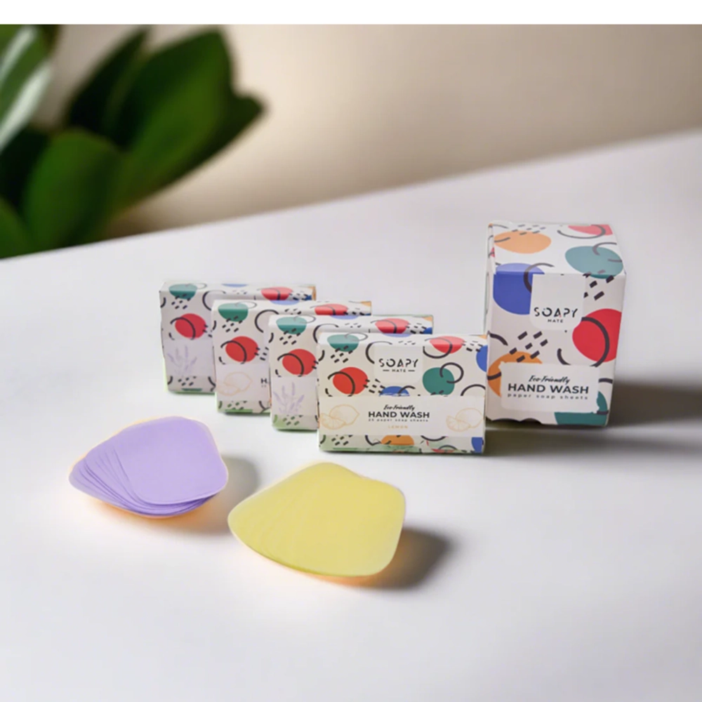 The Mini Paper Soap Sheets (4 Pack) offer a refined and eco-conscious handwashing experience tailored for people on the go. Each pack includes 100 single-use soap sheets—split evenly between two calming lavender-scented boxes and two energizing lemon-scented boxes. Crafted with plant-based ingredients like coconut oil and corn starch, these biodegradable sheets create a rich, moisturizing lather that leaves your hands clean, soft, and delicately fragranced.
